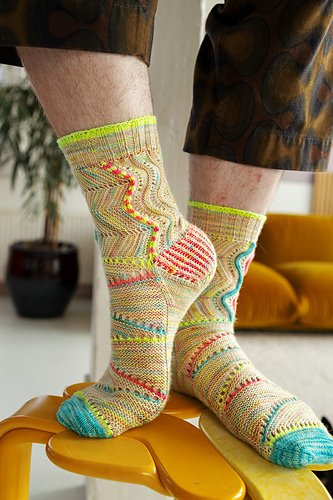 These socks feature a unique modular construction beginning with the leg knit sideways. Chevrons, waves, eyelets, and welts decorate the leg of the sock as you knit flat. The leg is then seamed together with a striped I-cord bind off. The cuff is picked up from the leg with 2x2 ribbing and color pop bind off. Choose between a garter stitch or two-color brioche heel flap to add another color pop accent as you work your way toward the foot. Short rows in garter stitch are knit flat with colorful eyelets for the top foot. Then the bottom foot is knitted separately in stockinette stitch while being modularly attached to the top foot fabric. A final color pop toe completes these adventurous Westknits socks.